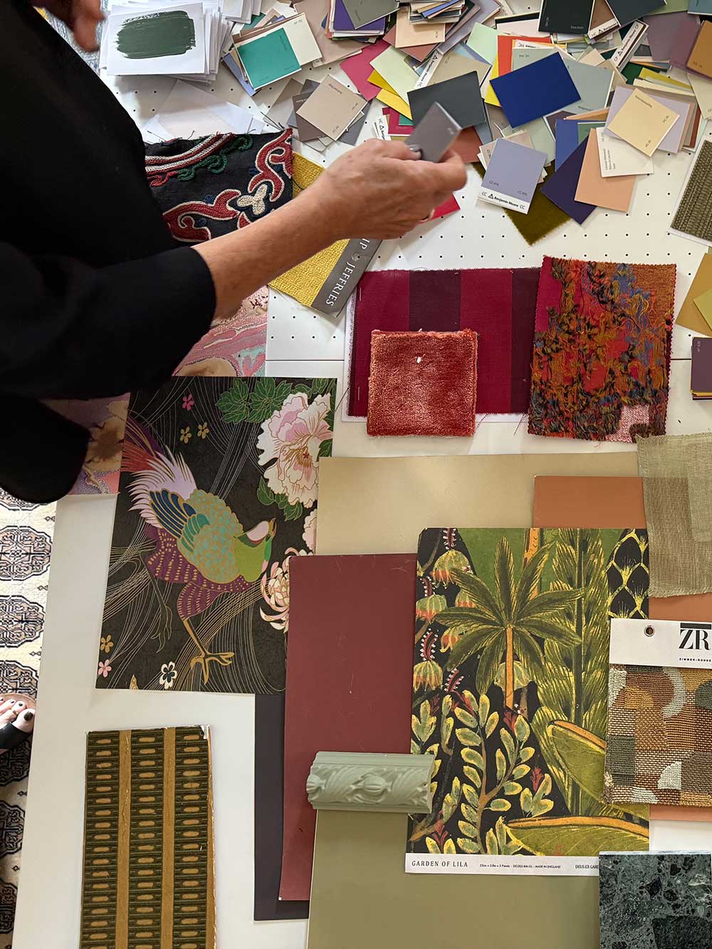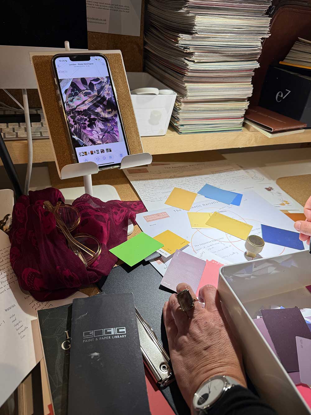 To conclude part 2, you’ll evolve your final colour scheme in the studio, with the help of designer fabrics, paint colours, and textural references. This will create a layered and more sophisticated version of the aesthetic narrative you built in part 1.